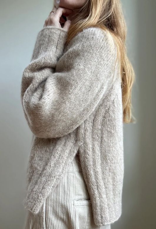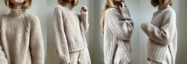 Классический вязаный свитер оверсайз реглан с высоким воротником и боковыми разрезами. Этот элегантный трикотаж с красивой драпировкой и удобным свободным силуэтом. Рукава широкие и сужаются к манжетам. Линия горловины формируется с помощью укороченных рядов после провязывания края. Поскольку свитер вяжется сверху вниз, вы можете легко примерять его в процессе работы.