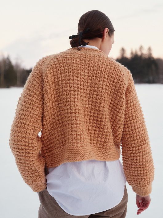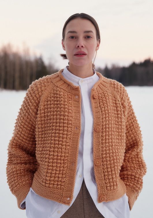Современный вязаный кардиган Cork с рукавами реглан выполнен сверху вниз рельефным узором. Кардиган связан из мягкой и объемной, слегка крученой пряжи. Кардиган свободного кроя, чтобы под него можно было поддеть более легкую одежду, он также может носиться как жакет осенью и весной. Основной узор повторяется каждые 4 ряда, что позволяет легко его запомнить. Кардиган отделан планками для пуговиц и воротником-стойкой, связанными резинкой. Благодаря конструкции сверху вниз, все длины можно изменять по своему усмотрению.