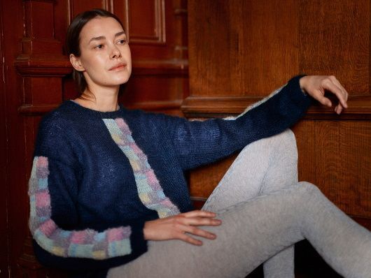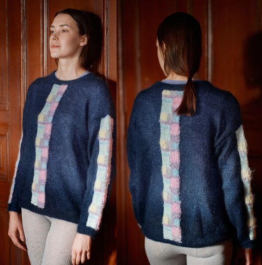 Vespera – это легкий и воздушный пуловер, в котором смешаны разные типы и толщины пряжи. Контрастные пряжи используются для вязания абстрактных блоков узора в центре переда, спинки и рукавов, выполненных методом интарсии. Узоры интарсии – это отличная возможность поэкспериментировать с различными комбинациями пряжи, особенно из ваших запасов. Добавьте этот пуловер в свой гардероб, надевая ее поверх платьев или топов с принтом, чтобы создать эффект многослойного узора.