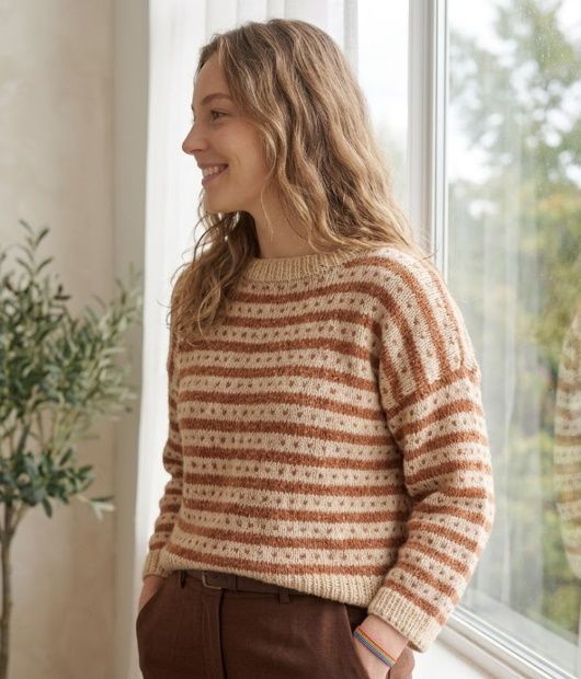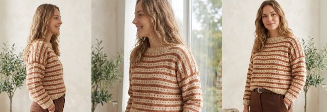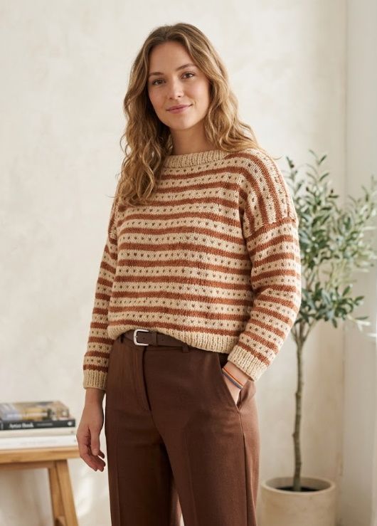 CinnamonRoll — это вязаный свитер, выполненный поворотными рядами для передней и задней панелей и на круговых спицах для рукавов, украшенный пушистым двойным воротником и милым полосатым узором с точками. Это простой и доступный паттерн с небольшими вызовами, идеально подходящий для начинающих, которые хотят повысить свой уровень в вязании.