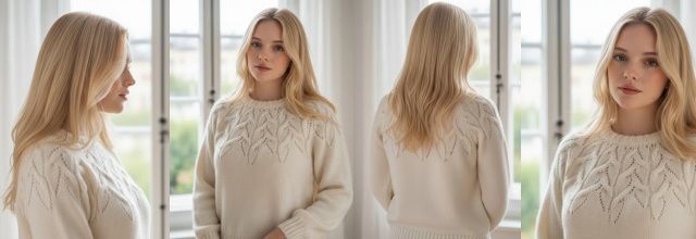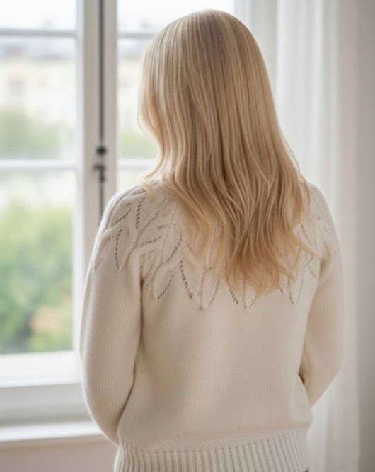 Свитер Efeu (Плющ) вяжется сверху вниз. И узор и форма формируются простым следованием схеме. Таким образом вязание свитера – легкая и увлекательная работа. У свитера рельефный узор в виде листьев на кокетке, который создается с помощью убавок, накидов и нескольких жгутов.