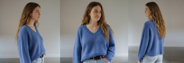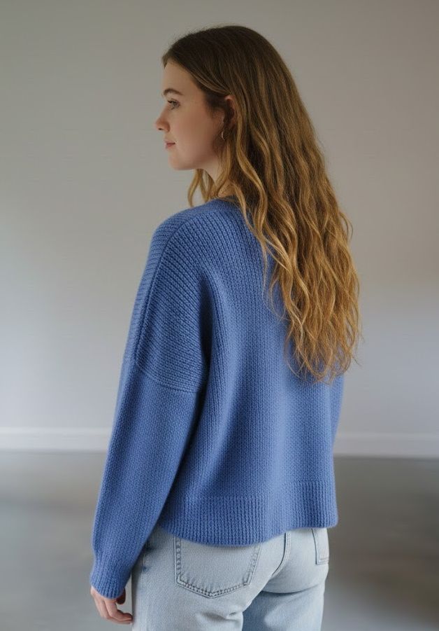 Свободный V-образный свитер — это модель, связанная сверху вниз, с объемным, прямоугольным силуэтом, спущенным плечом и глубоким V-образным вырезом. Кокетка спинки формируется с помощью немецких укороченных рядов для лучшей посадки, затем поднимаются петли и вяжутся плечи одновременно с формированием выреза горловины. Перед и спинка соединяются, и тело вяжется по кругу, а рукава поднимаются по проймам и вяжутся сверху вниз. Разработанная с утрированными пропорциями, эта модель идеально подходит для многослойных образов поверх обычной футболки.