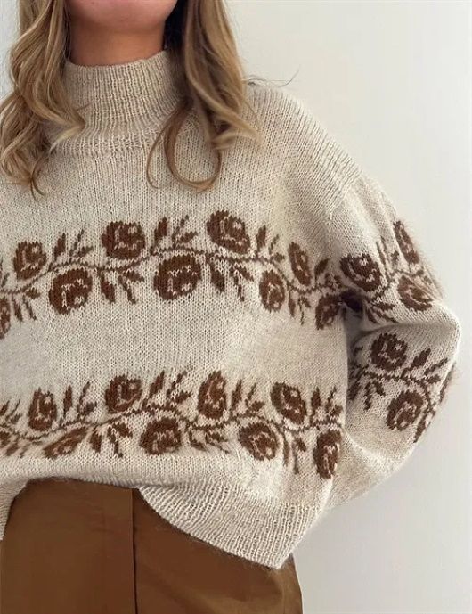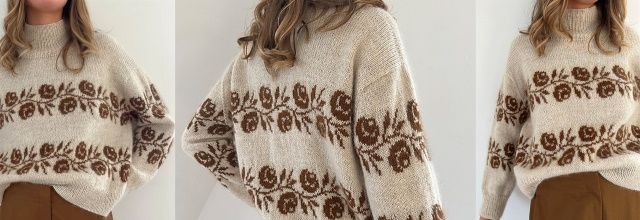Роскошный вязаный свитер Rosie украшен прекрасным узором с розами на корпусе и рукавах. Его сложная конструкция представляет собой смесь реглана и округлой проймы, что позволяет вязать всё основное полотно лицевой гладью по кругу с лицевой стороны.