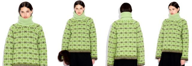 Вязаный свитер Roys — настоящий манифест уютного ретро-футуризма. Он сочетает в себе традиционную вязку и смелую цветовую палитру. Основной цвет — сочный фисташковый (или цвет зеленого яблока), который дополнен контрастными деталями. Геометрический орнамент, напоминающий стиль 70-х. Это повторяющийся мотив из квадратов и прямоугольников, создающий эффект «оптической иллюзии» или цифрового пиксель-арта. Это акцентная вещь в духе «библиотечного шика» или современной эклектики. Он выглядит одновременно и как винтажная находка, и как предмет из коллекции высокого модного бренда.