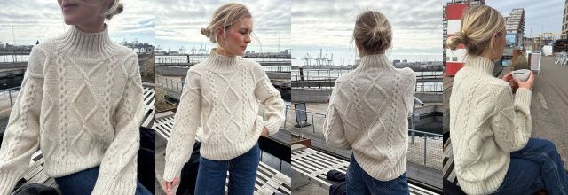 Свитер Сага вяжется сверху вниз текстурным узором. Сначала верхняя часть кокетки спинки вяжется поворотными рядами с прибавками. Затем плечи вяжутся из петель, поднятых вдоль кокетки спинки. После этого работа соединяется на круговые спицы для вязания по кругу, одновременно поднимаются петли для рукавов, и остальная часть кокетки вяжется по кругу с регланными прибавками. Корпус и рукава вяжутся по кругу на круговых спицах. В конце вяжется резинка по вырезу горловины.