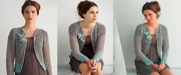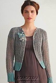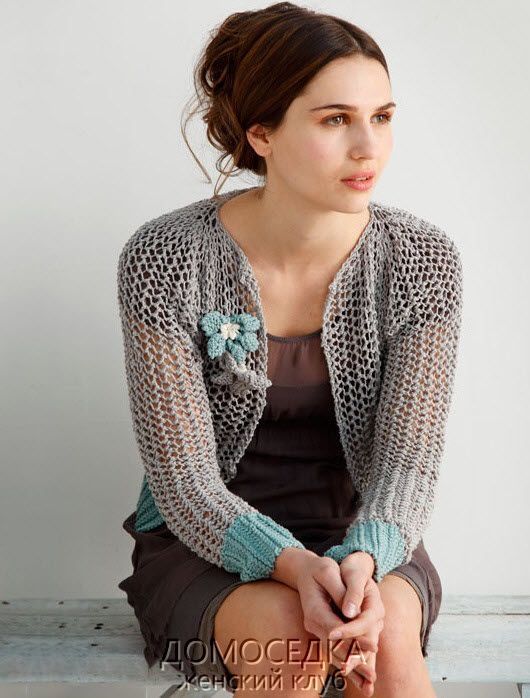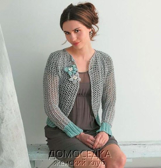 Чтобы связать кофточку потребуется: пряжа Birch (65% хлопок, 35% шелк; 90 м/50 г) - 7 (9, 10, 11, 12, 13) мотков светло-голубого цвета (основная нить) и 1 (2, 2, 2, 2, 3) мотков ярко-голубого цвета, немного пряжи белого цвета для цветка; прямые спицы 4 мм, круговые спицы 4.5 мм длиной 70 см; маркеры и держатели для петель.