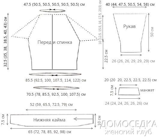 Повторить прибавления в каждом 8-м ряду еще 3 (4, 5, 5, 4, 4) раза, затем в каждом 6-м ряду 0 (0, 0, 0, 2, 3) раза, закончить в изнаночном ряду = 44 (48, 52, 56, 60, 64) п. (прибавленные петли вводить в узор сетка). Затем закрыть 0 (0, 0, 2, 4, 4) п. в начале 2-х следующих рядов и перенести оставшиеся 44 (48, 52, 52, 52, 56) п. на держатель. Связать второй рукав аналогично.