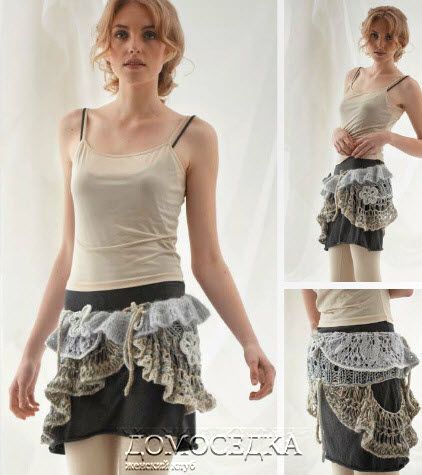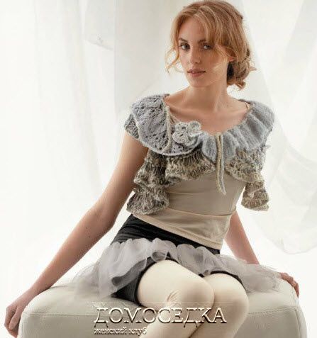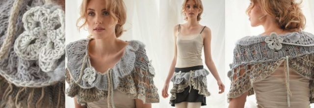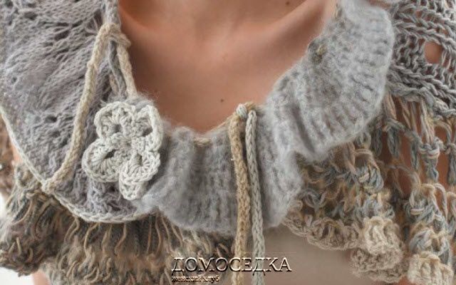 Хорошенькая вязаная ажурная пелерина из пяти оборок выполнена спицами и крючком из разных видов пряжи.