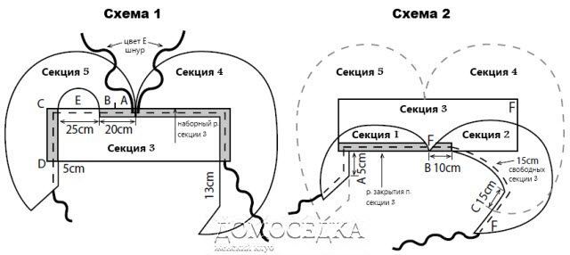 Вдеть от центра (точка F) другой конец третьего шнура, соединяя 3 секцию с секцией 2 прихватив только 10 см обеих секций (В на схеме2). Далее продеть шнур через 15 см секции 2. Следующие 15 см (С на схеме 2) продеть, соединяя секцию 2 с верхней левой оборкой (секция 4).