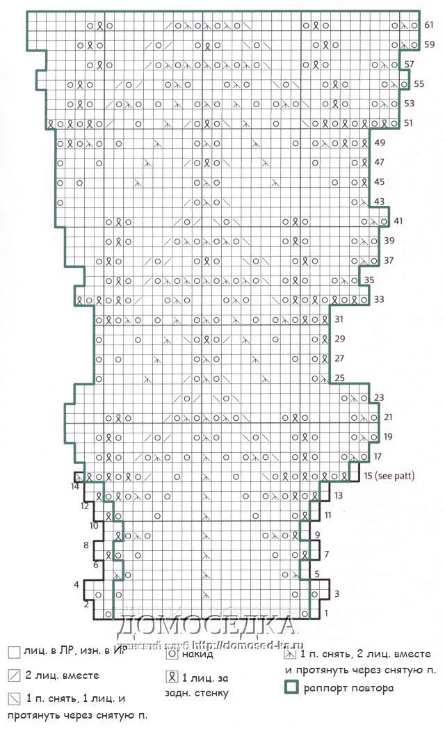 Продолжить по схеме, повторяя раппорт по кругу 4 раза. Связать 61 ряд по схеме = 160 п. Затем выполнить 6 круг. рядов лицевыми и закрыть петли.