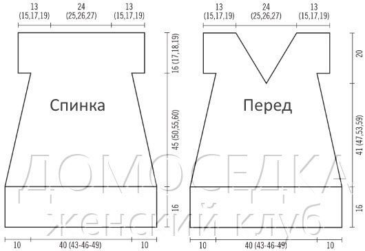 Поднять и вязать лицевыми 135 (144, 154, 163) петель вдоль горловины спинки и V-образного выреза. Далее вязать 7 рядов платочной вязкой и убавлять в каждом ряду по 1 петле с обеих сторон от 3-х центральных петель переда. Закрыть все петли.
