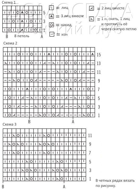 Узор по Схеме 1 (количество петель кратно 8 + 1 петля).