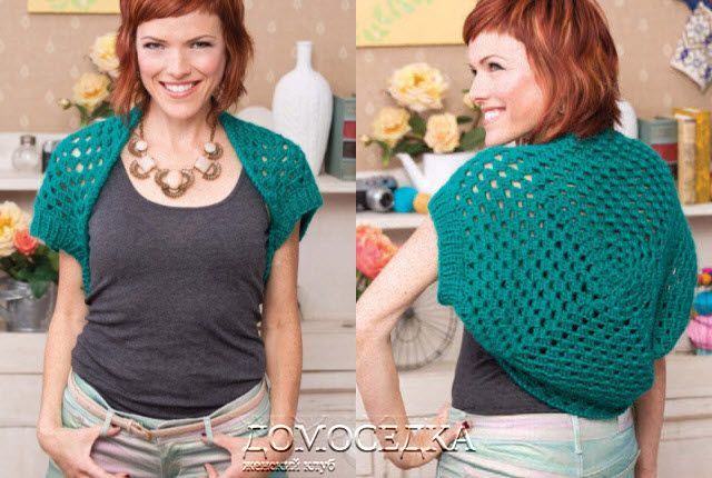 С лицевой стороны присоединить нить к одному из углов и равномерно поднять на спицы 56 (62) лиц. вдоль боковой стороны (по пройме). Отметить маркером начало ряда и соединить в круг. Вязать резинкой 1 лиц., 1 изн. 4 см. Закрыть петли. Выполнить отделку второй проймы. Примерить шраг. Выполнить боковые швы нужной длины.
