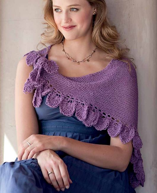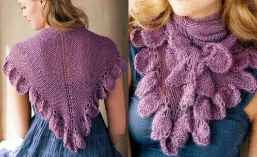 Платок является двухсторонним и вяжется очень легко. Кайма выполняется из полос, которые уменьшаются вдоль одной стороны, что делает похожим на ажурное вязание крючком на шпильке.