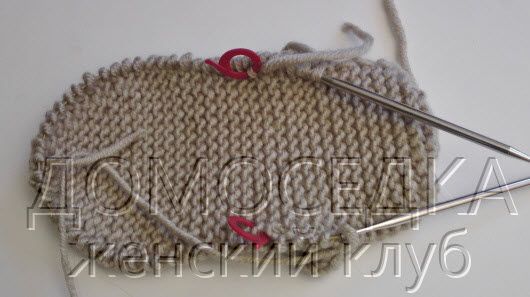 Отметить маркерами с каждой стороны ступни по 10 (11, 12, 13) см от набора петель.