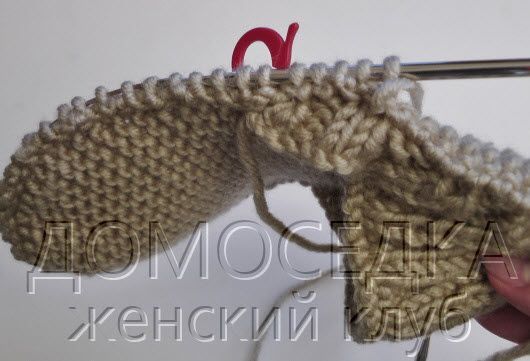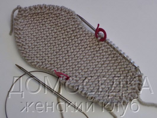 Далее вязать платочной вязкой прямо, пока длина детали не составит 12 (13, 14, 15) см от начала работы, закончить в изнаночном ряду.