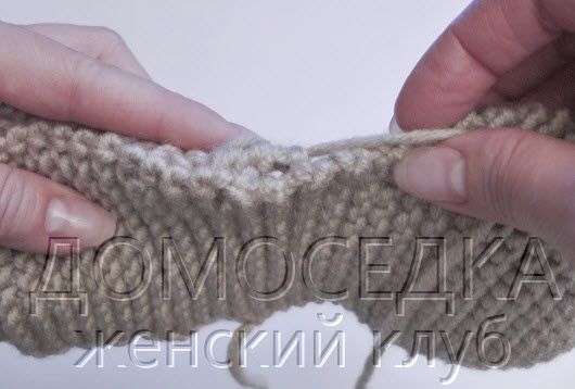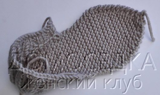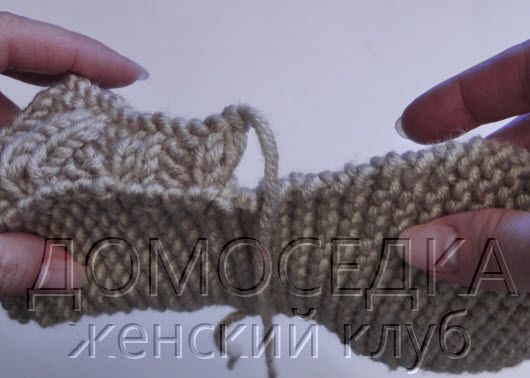 Примечание: вывернуть деталь на изнаночную сторону и совместить конец боковой стороны пятки с основной кромкой (в этом месте поднимать петли через 2 слоя).