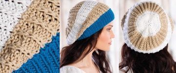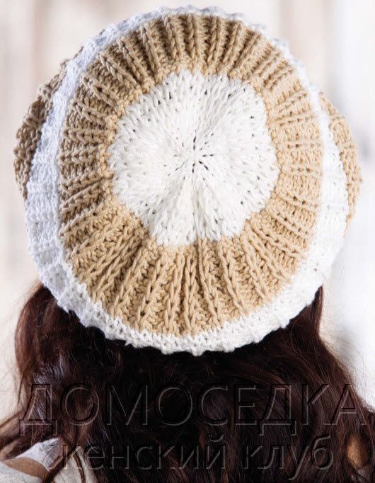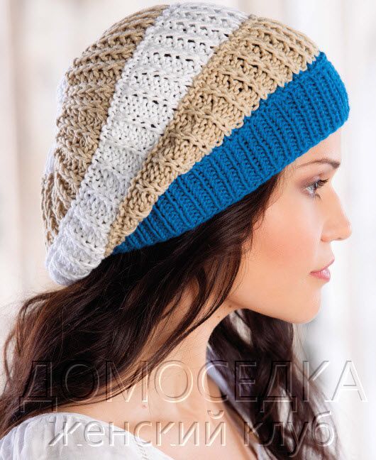 Весенний берет от Lena Skaverson, вязаный спицами круговыми рядами из пряжи трех цветов.