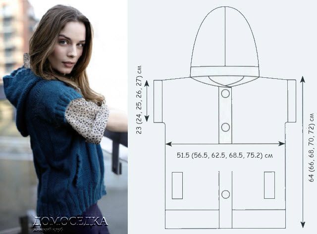 С лицевой стороны набрать лицевыми 10 п. по закрытым петлям правой верхн. стороны переда, затем 15 (15, 17, 17, 19) п. по правой стороне горловины, далее 35 (35, 37, 37, 39) п. по горловине спинки, далее 15 (15, 17, 17, 19) п. по левому краю горловины, затем 10 п. по закрытым петлям левой верхн. стороны переда = 85 (85, 91, 91, 97) п. Вязать капюшон следующим образом: