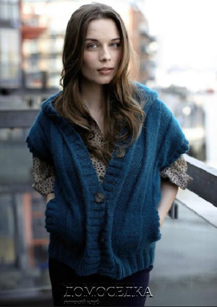 Теплая безрукавка с капюшоном от дизайнера Мартина Сторей связана спицами из шерстяной пряжи.