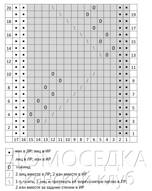 Вязать по схеме, на которой показаны лицевые и изнаночные ряды. Раппорт узора 15 петель выделен серым цветом.