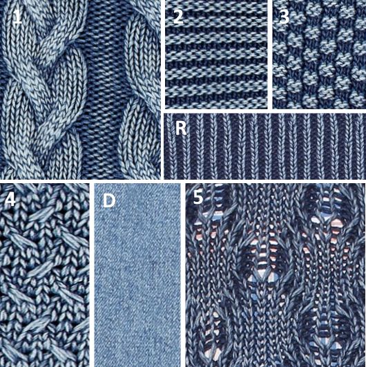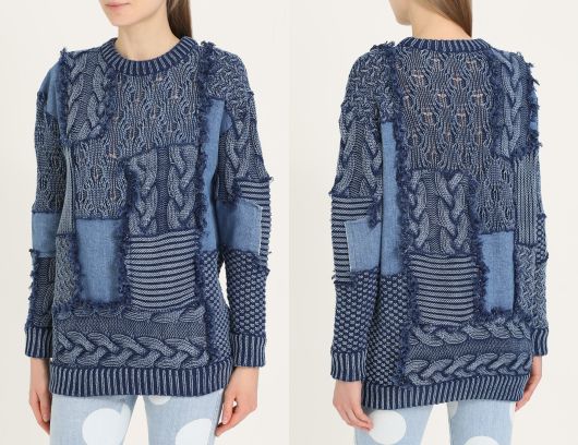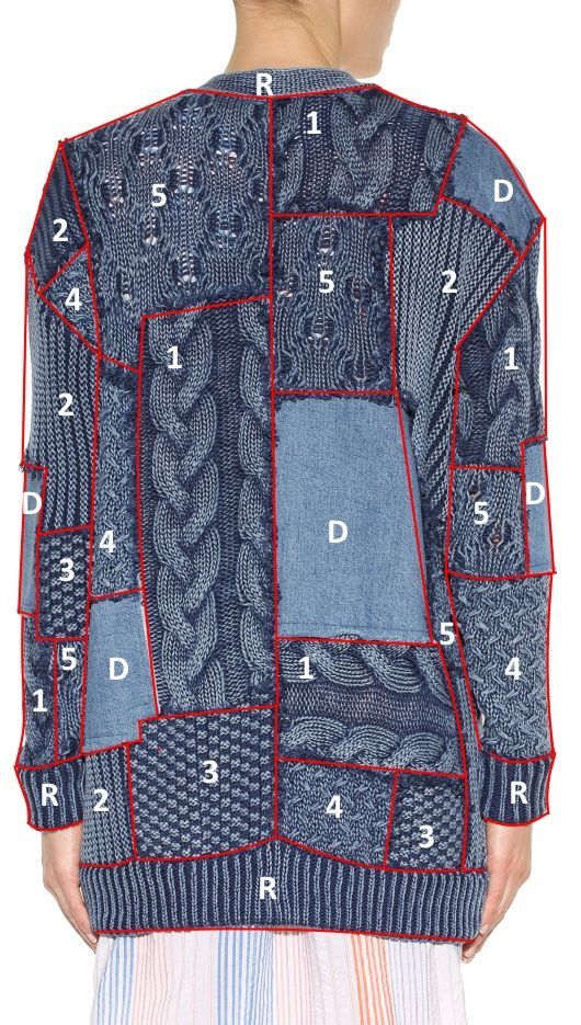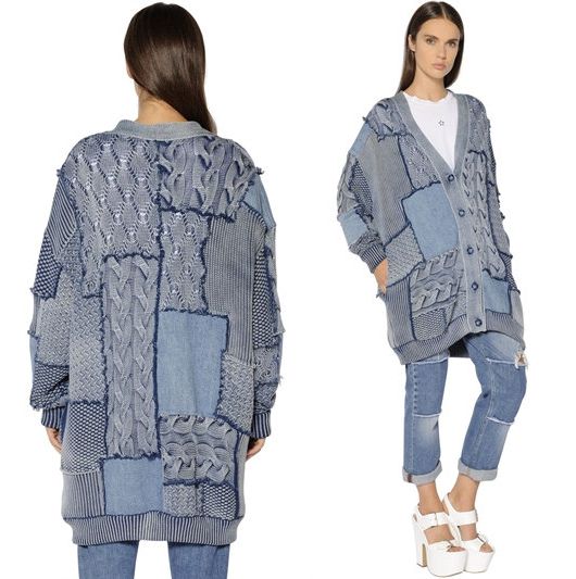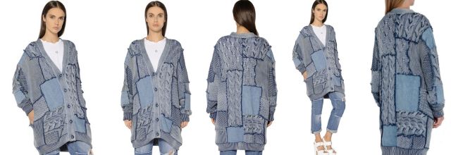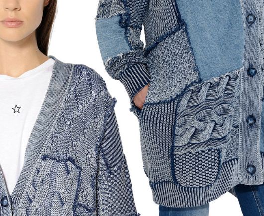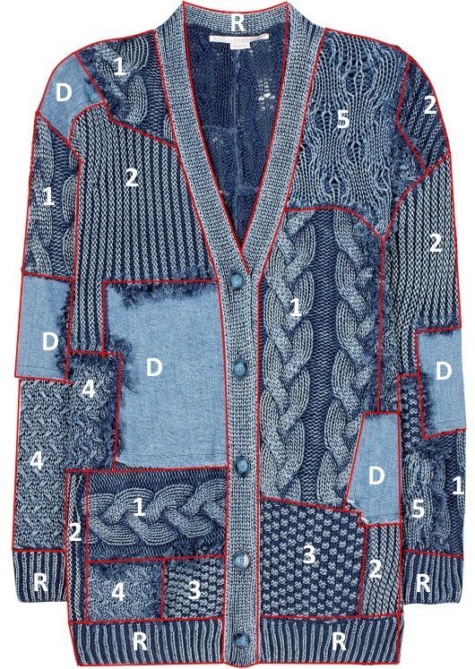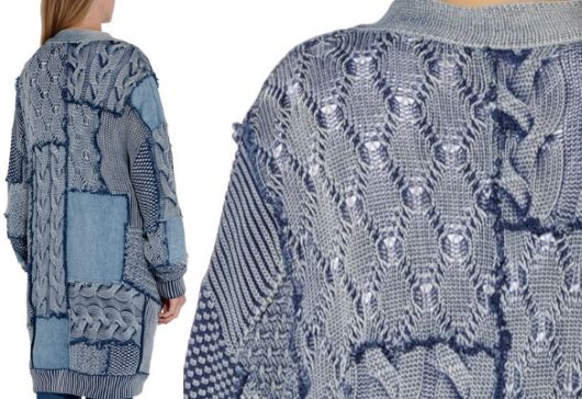 Как видно, кардиган выполнен в технике пэчворк из эластичного хлопка и прямоугольников с разными фактурными узорами цвета denim. Открытые срезы швов между вязаными мотивами отделаны бахромой. Вставки из джинсовой ткани не обработаны и настрочены сверху на трикотаж. В боковых швах располагаются внутренние карманы.