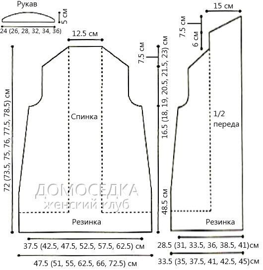Повторить убавления в каждом 6 (8, 8, 6, 8, 6)-м ряду еще 8 (7, 6, 8, 7, 8) раз = 76 (86, 96, 106, 116, 126) п. Далее вязать прямо, пока высота детали не достигнет 48.5 см, закончить в изнаночном ряду.