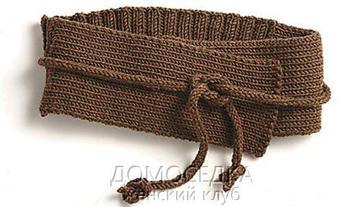 На обоюдоострые спиц набрать 3 петли и вязать следующим образом: 3 лиц., *передвинуть петли на другой конец спицы и вязать 3 лиц. (нить позади); повторять от * пока длина шнура не достигнет 115 (125, 135, 145) см. Закрыть петли. Вдеть шнур в отверстия центральной части.