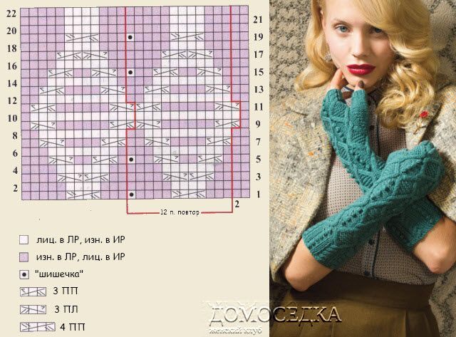 1-й р.: начать по схеме витым узором с "шишечками", 12 п. раппорта повторить 3 раза, закончить ряд по схеме.
