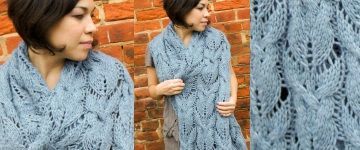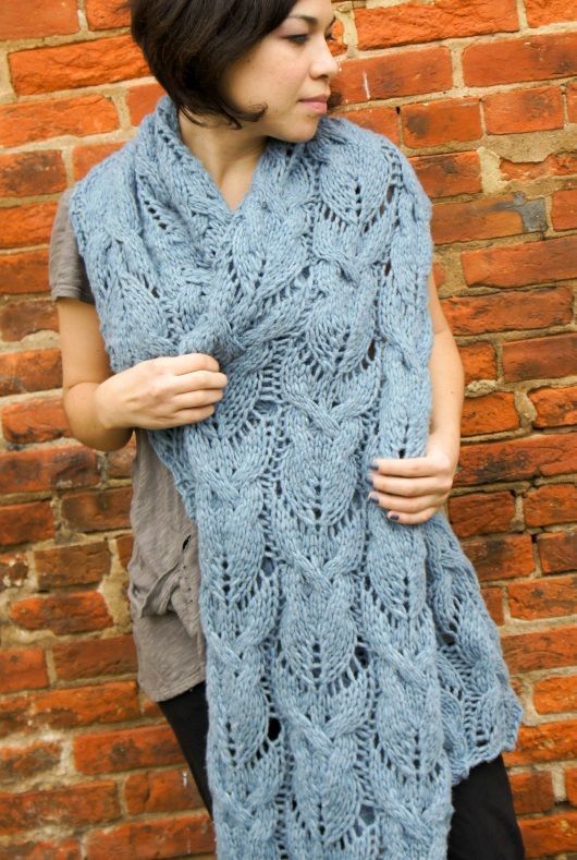 Красивый вязаный длинный шарф выполняется спицами из толстой пряжи узором из листьев с косами.