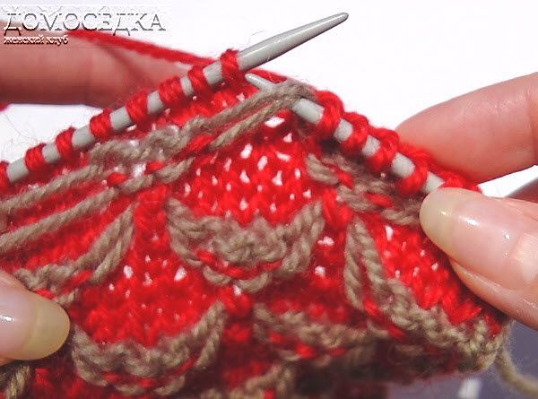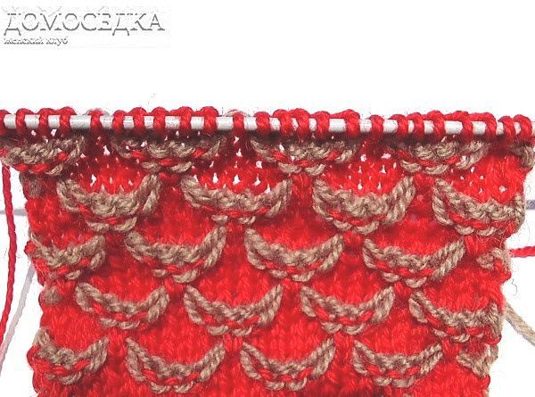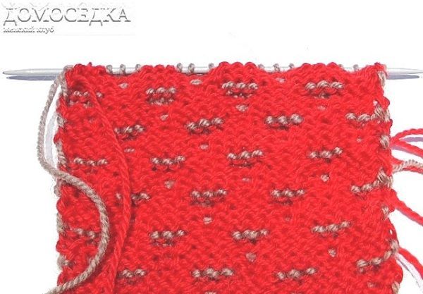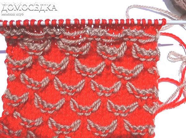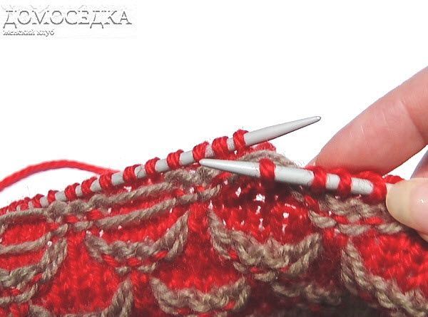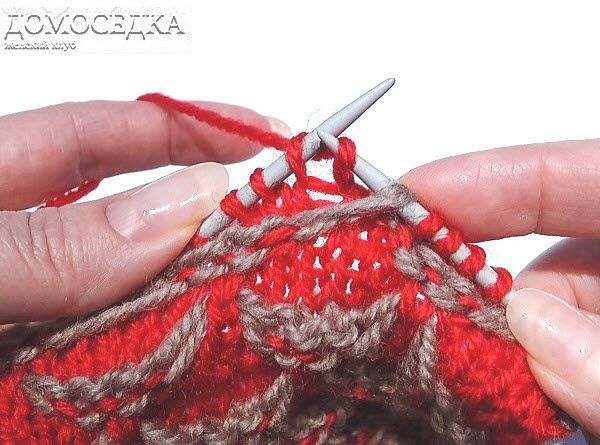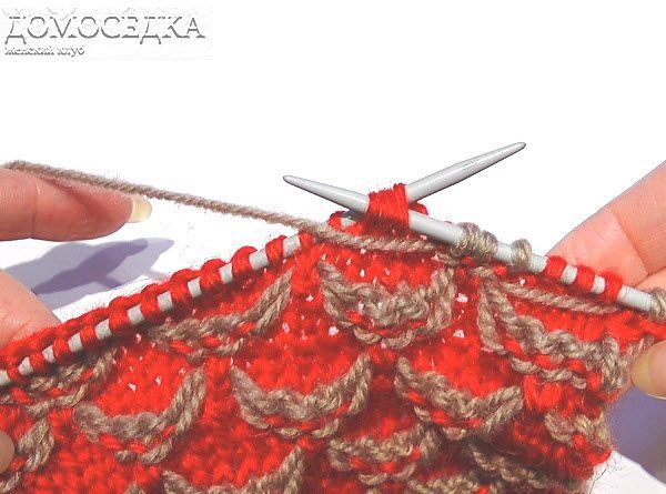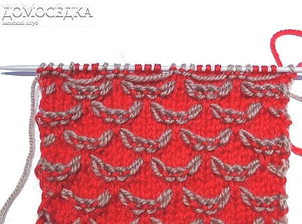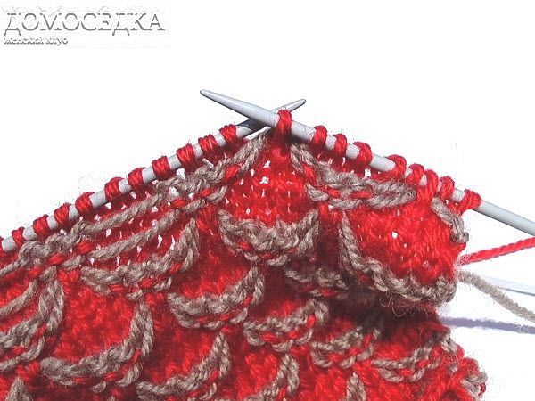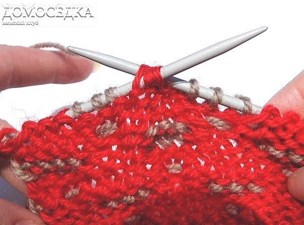 В лицевых рядах снимать 3 п. как изнаночные. Нить протягивать с лицевой стороны работы (фото 1).