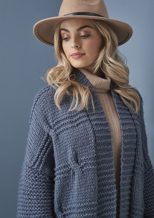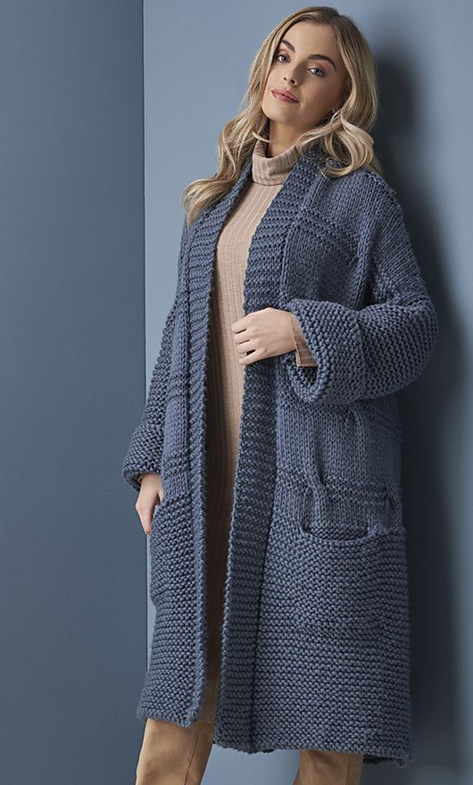 Объемное элегантное вязаное пальто, которое можно надеть независимо от времени года. Оно согреет вас и подарит уют. В узоре этой модели - сочетание платочной вязки, лицевой глади и причудливых коротких кос. Связать его из толстой шерстяной пряжи можно легко и быстро Пальто с удобными большими карманами выполнено из отдельных деталей, которые вяжутся снизу вверх, а затем сшиваются вместе.