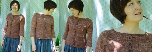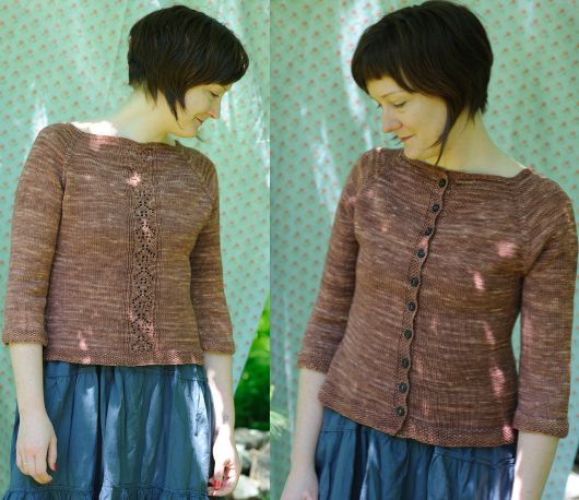 Интересная вязаная модель Gemini, которую можно носить задом наперед. Если надеть эту штуку кружевной вставкой спереди и застегнуть сзади, то получится пуловер. Если же застегнуть пуговицы спереди, то это уже кофточка. Конструкция разработана сверху вниз одной частью с формированием реглана.