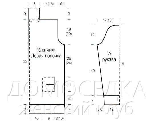 Выполнить пройму с правой стороны как на спинке = 56 (59) петель. Когда высота проймы составит 19 (20) см, закрыть с правой стороны 36 (39) петель для плеча. На оставшихся 20-ти петлях связать еще 9 см (18 рядов) для воротника и перенести петли на держатель.