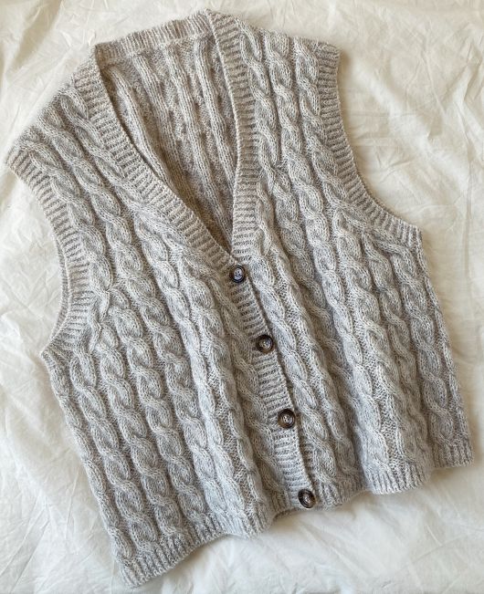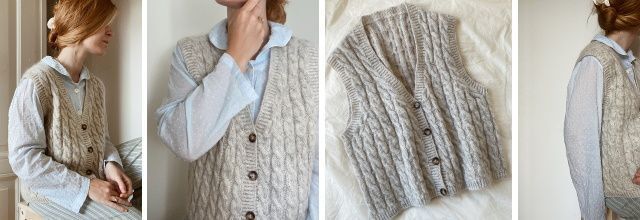 Вязаный жилет с V-образным вырезом горловины и узором с косами. Классический стиль с акцентом на детали. Изящная конструкция плеча и формирование выреза горловины привлекают взгляд. У жилета достаточно свободное прилегание, что позволяет носить его поверх другой одежды. Жилет вяжется сверху вниз, без швов.