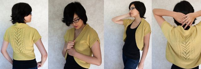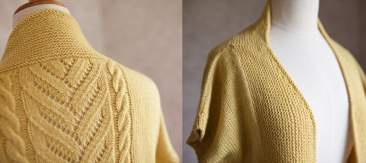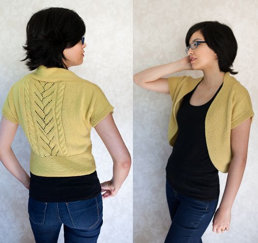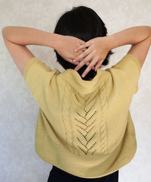 Короткий вязаный шраг Huatau с цельнокроенными рукавами покорит вас своей воздушной легкостью, но защитит от порывов прохладного ветерка. Спинку шрага украшают косы и ажурный узор, а полочки связаны лицевой гладью. Воротник и планки из платочной вязки позволяет изделию хорошо держать форму.