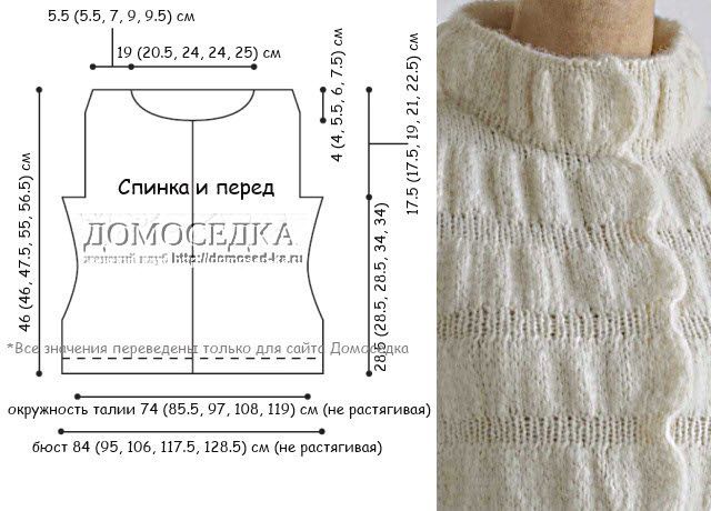 С лицевой стороны на спицы меньшего размера поднять и вязать лицевыми 17 (19, 21, 23, 23) п. вдоль правой стороны горловины, затем 28 (30, 34, 34, 36) п. вдоль горловины спинки, далее 17 (19, 21, 23, 23) п. вдоль левой стороны горловины = 62 (68, 76, 80, 82) п. Начать в изнаночном ряду и связать 3 ряда лицевой гладью. Далее продолжить основной вязкой вплоть до 11 (11, 11, 133, 13) ряда. Выполнить 1 ряд лицевыми петлями на изнаночной стороне (для перегиба) и связать еще 6 рядов лицевой гладью, закончить в изнаночном ряду. Отрезать нить, оставить длинный отрезок (в 4 оборота вокруг ворота). Сложить ворот на изнаночную сторону по линии сгиба и пришить к горловине.