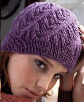 Красивая шапочка, с узором в виде спирали, связана спицами по кругу.