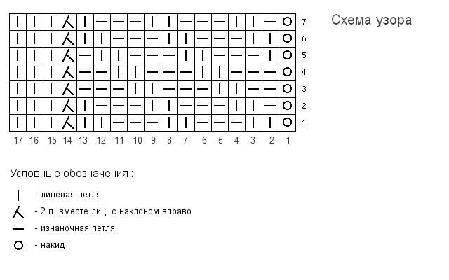4-й п.: накид, 3 изн., 2 лиц., 2 изн., 2 изн. вместе, 2 лиц с наклоном вправо, 3 лиц. Повторить 9 раз = 117 петель.