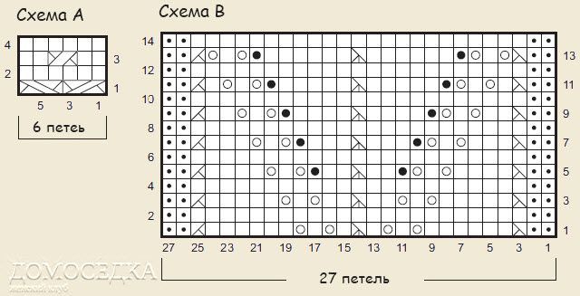 27 п. и 34 р. = 10х10 см узором по схеме А спицами 5 мм.