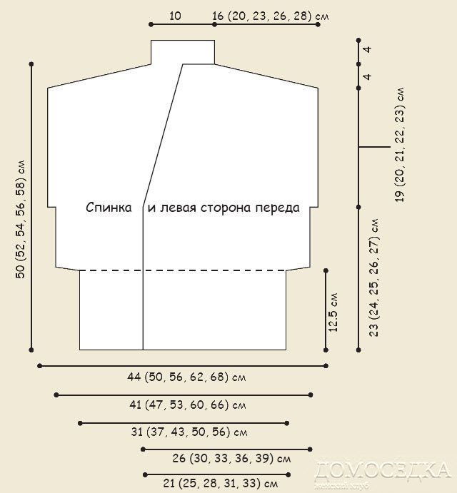 Далее вязать прямо по рисунку узора 3 ряда. Убавить по 1 п. в каждом 4-м лиц. ряду 14 раз следующим образом: вязать по рисунку до 13-ти последних п.: 2 изн. вместе, довязать ряд до конца по рисунку. Одновременно, когда пройма достигнет примерно 19 (20, 21, 22, 23) см, выполнить вырез горловины как для 1/2 спинки. Закрыть оставшиеся 13 п.