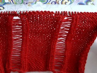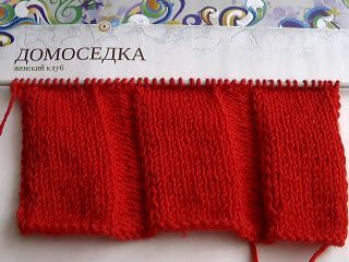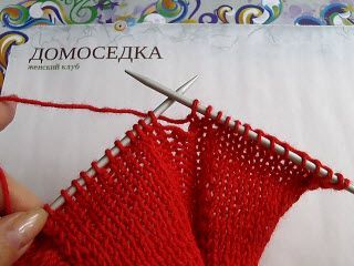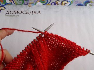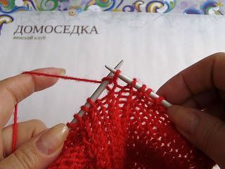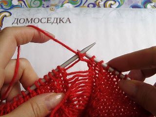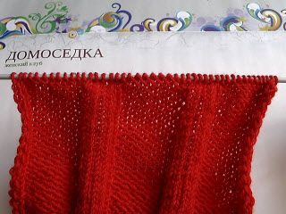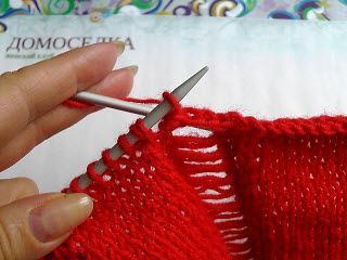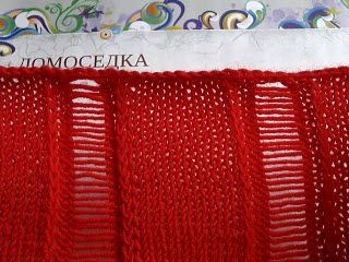 Протянуть нить пряжи малинового цвета по краям дорожек из спущенных петель.