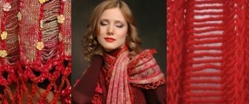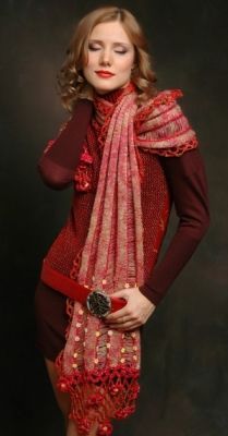 Для вязания потребуется 200 г пряжи цвета коралла (50% мохер, 40% нейлон, 10% таталлик-полиэстера, 185 м/50 г); 50 г красной пряжи (35% шелк, 35% хлопок, 25% вискоза, 5% металлик-полиэстер, 115 м/50 г); 20 г пряжи малинового цвета (80% шерсти, 15% нейлон, 5% металлик-полиэстер, 48 м/50 г); спицы №5 и крючок №5; бисер, пайетки в форме цветов. Описание для этого шарфа было доработано.
