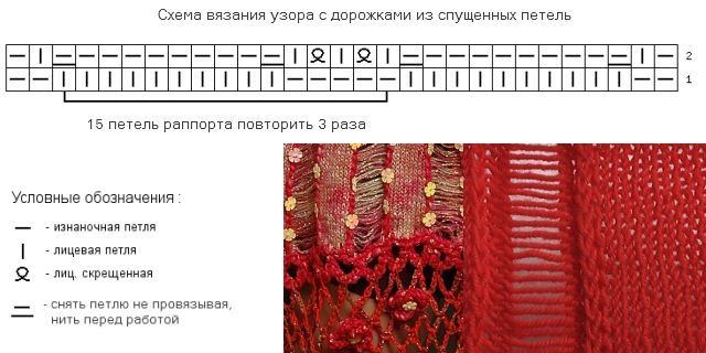 В предпоследнем изнаночном ряду работы, распустить одну центральную изнаночную петлю каждого раппорта до основания работы.