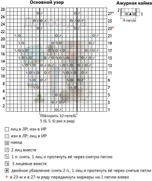 1-й круг: [накид, двойное убавление, накид, 1 лиц] повторять до конца круга.