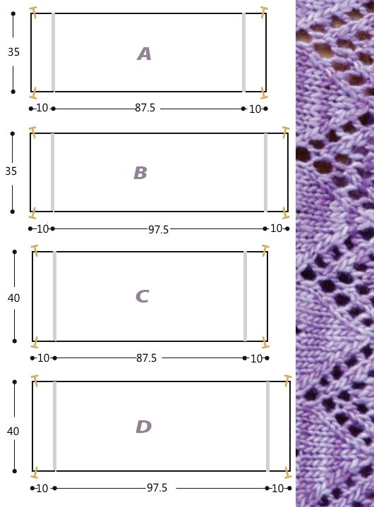 На спицы меньшего размера вспомогательной нитью выполнить предварительный набор из 67 (77, 67, 77) петель. Дальше вязать основной нитью: 1 ряд лицевыми петлями, 1 ряд изнаночными петлями. Продолжить основным узором по схеме Дальше вязать основной нитью: 1 ряд лицевыми петлями, 1 ряд изнаночными петлями. Продолжить основным узором по схеме. В первом ряду узора поместить маркер после 8-й петли, затем повторять 10 петель раппорта 5 (6, 5, 6) раз в ряду, поместить второй маркер и довязать 9 последних петель. Повторить 1-28 ряды вcего 8 (9, 8, 9) раз, убавив в последнем ряду 2 (0, 2, 0) петли = 65 (77, 65, 77) петель.