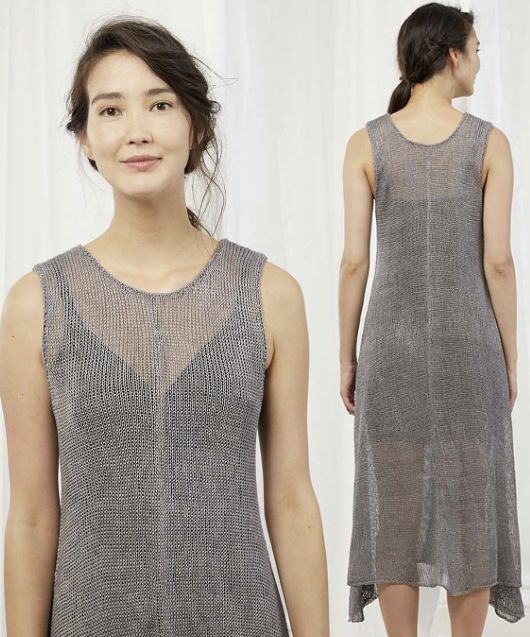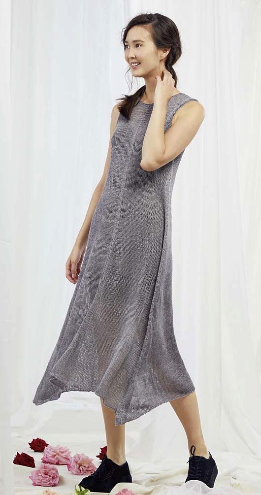 Легкое вязаное спицами платье с асимметричным подолом выполнено из экологической пряжи.