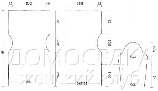 Набрать 97 (109) петель и вязать основным узором 1. На высоте 50 (48) см выполнить пройму следующим образом: закрыть с обеих сторон в каждом 2-м ряду 2 раза по 2 петли и 6 раз по 1 петле = 77 (89) петель. Когда высота проймы достигнет 16 (18) см прибавить с обеих сторон в каждом 2-м ряду 6 раз по 1 петле, затем набрать по 2 петли 1 раз = 93 (105) петли. На высоте 70 см от начала работы отложить все петли.