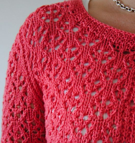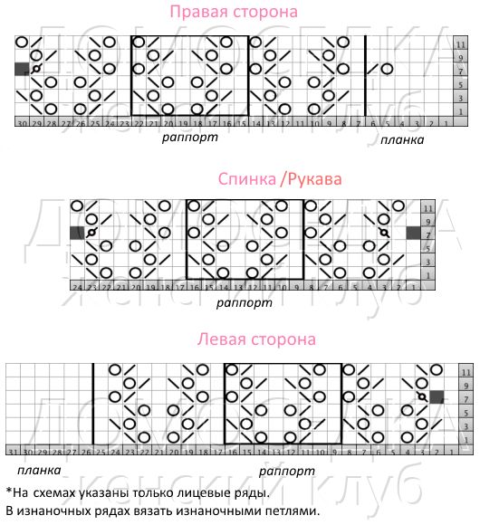 Примечание: в ажурном узоре правой стороны переда не выполнять накиды в последнем повторе, далее не выполнять накиды в первом и последнем повторе рукавов и спинки и в первом повторе левой стороны переда, пока вы не достигнете следующие 2 лиц вместе или после ССЛ. Очень помогут маркеры между каждым повтором; не забывайте выполнять петли для пуговиц.