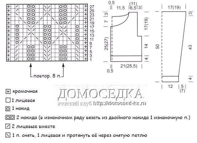 Плотность вязания: 17.5 п. и 23 р. = 10х10 см ажурным узором спицами 4.5 мм.